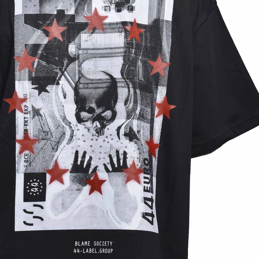 Maak kennis met het 44 Label Group Heren Katoenen Jersey T-Shirt. Gemaakt van zacht katoenen jersey, heeft dit relaxte t-shirt een micro-elastische ribboord, dropped shoulder en korte mouwen voor ultiem comfort. De voorkant toont een opvallende rode Blame society print, terwijl de achterkant pronkt met een levendig multicolor maxi print. Afgewerkt met een rechte zoom, is dit t-shirt perfect om een vleugje persoonlijkheid toe te voegen aan je casual outfits.