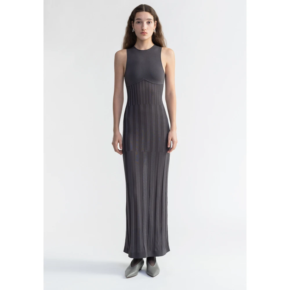 Onze Clara maxi-jurk is gebreid van een slinky garen met een rijke, zijdeachtige uitstraling. Dit elegante stuk heeft een langgerekte aansluitende silhouet, een bustiertop en een semi-transparant lichaam dat moeiteloos afhangt.
