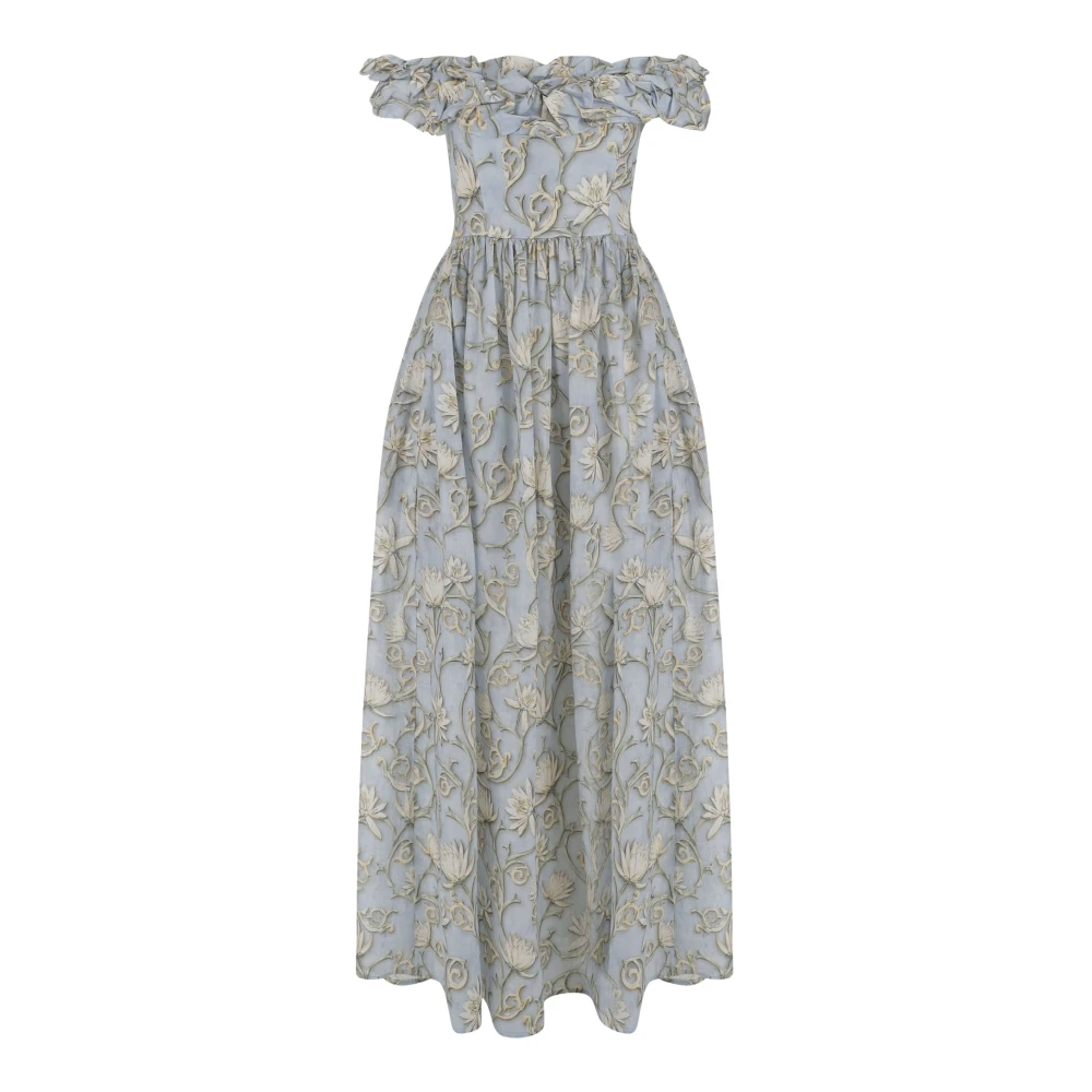 Ontdek de vrouwelijke charme van Agua by Agua Bendita met deze blauwe jurk met ruche details en een all-over bloemenprint motief. Gemaakt van katoen, is deze jurk perfect voor de moderne vrouw.