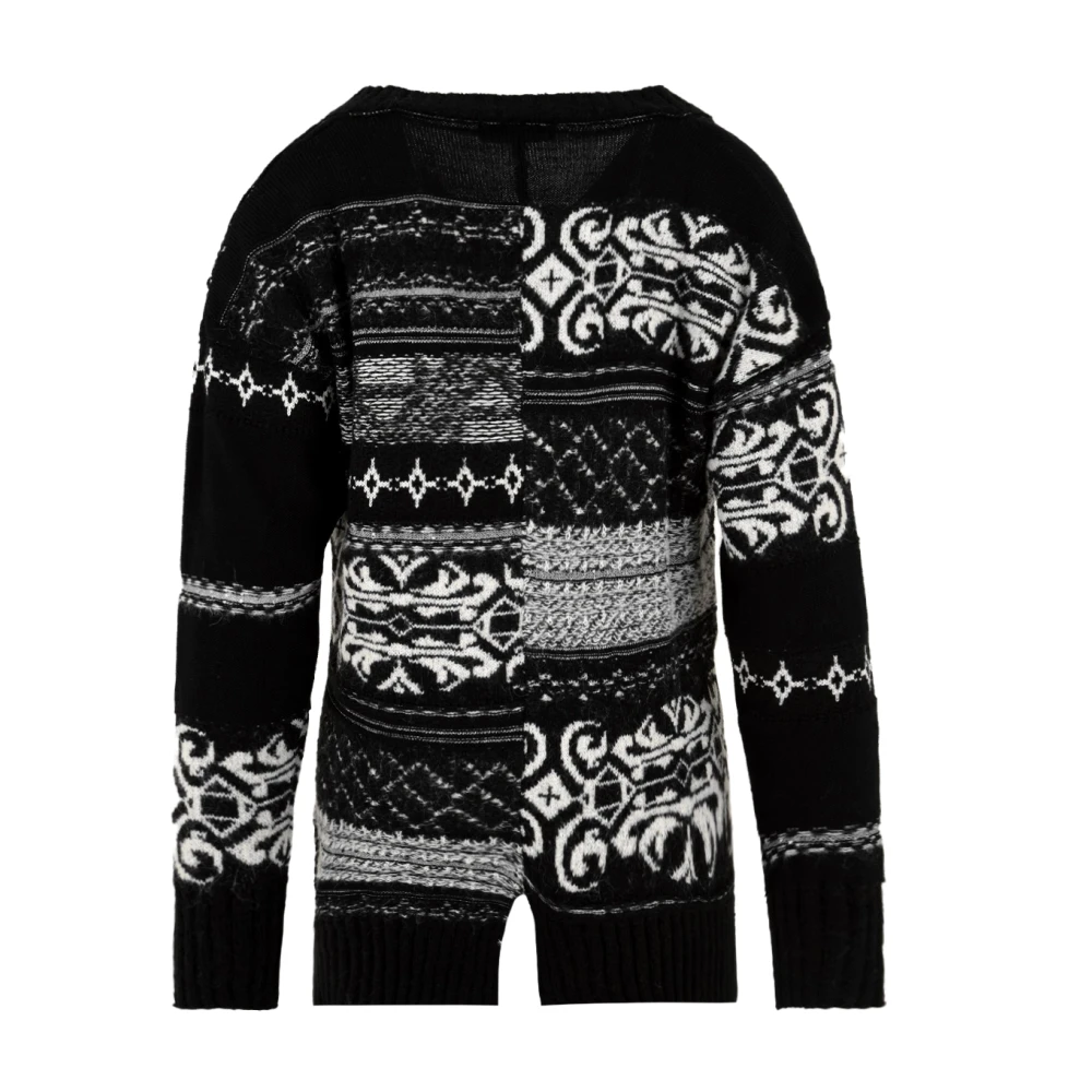 Upgrade je wintergarderobe met deze Akep zwarte V-hals cardigan voor vrouwen, met een geometrisch patroon. Deze cropped trui heeft een asymmetrische snit, kort aan de voorkant en langer aan de achterkant met een onregelmatige zoom. Model draagt maat S en is 170 cm lang. Handwas aanbevolen, strijk op gemiddelde temperatuur. Perfect voor het herfst-winterseizoen. Zwarte V-hals cardigan voor vrouwen in regular fit, ideaal voor herfst-winter Mgkd 07014Zwart.
