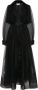 Zwart, overlay van tule, tulen mouwen, ballonmouwen, knoopsluiting aan de voorkant, taille met ceintuur en midi-lengte.