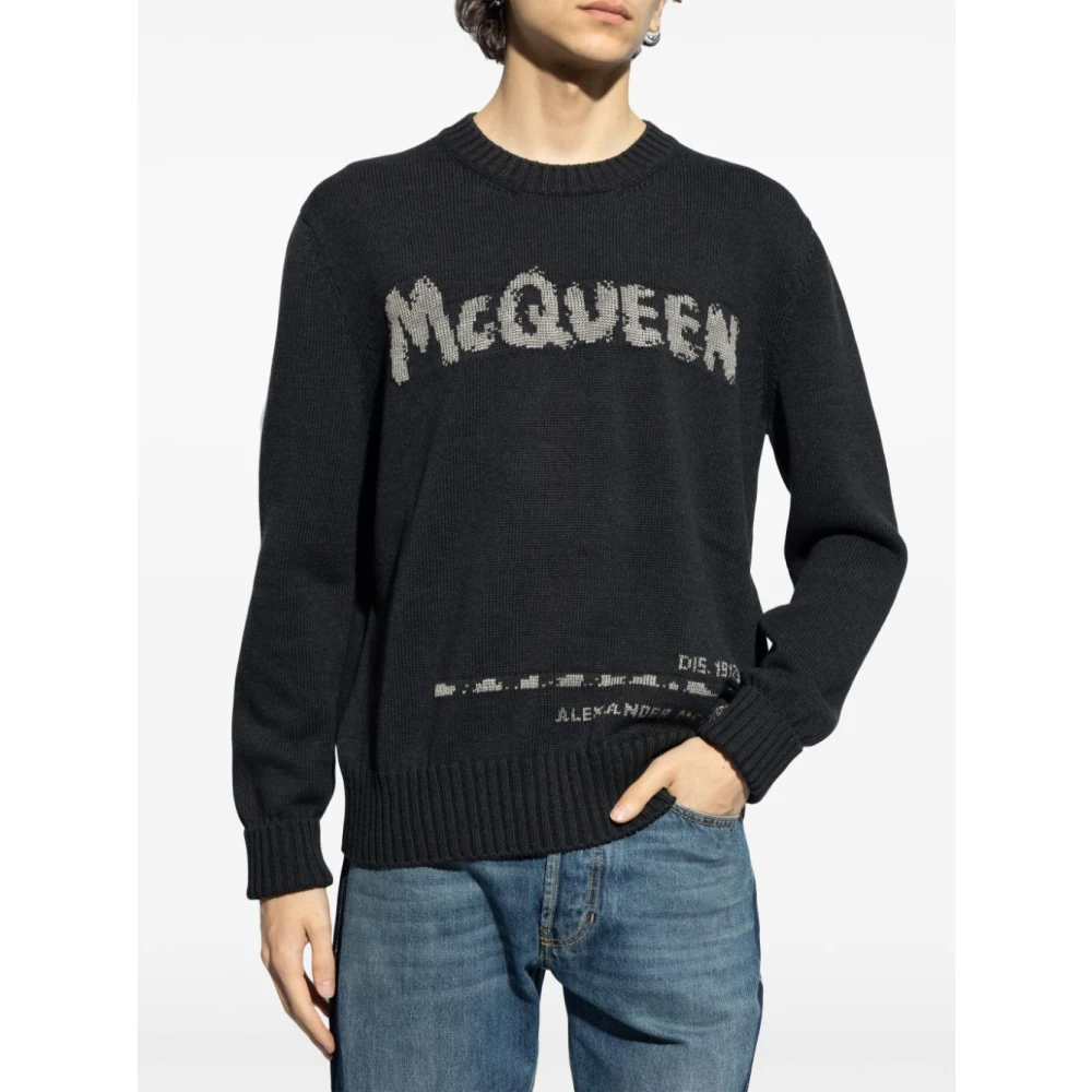 Upgrade je stijl met deze zwarte ronde hals gebreide trui van Alexander Mc Queen voor heren. Gemaakt in Itali van 100% biologisch katoen, met een ivoren graffiti-effect Mc Queen-logo intarsia. De geribbelde details op de kraag, manchetten en zoom voegen een vleugje verfijning toe. Regelmatige pasvorm.