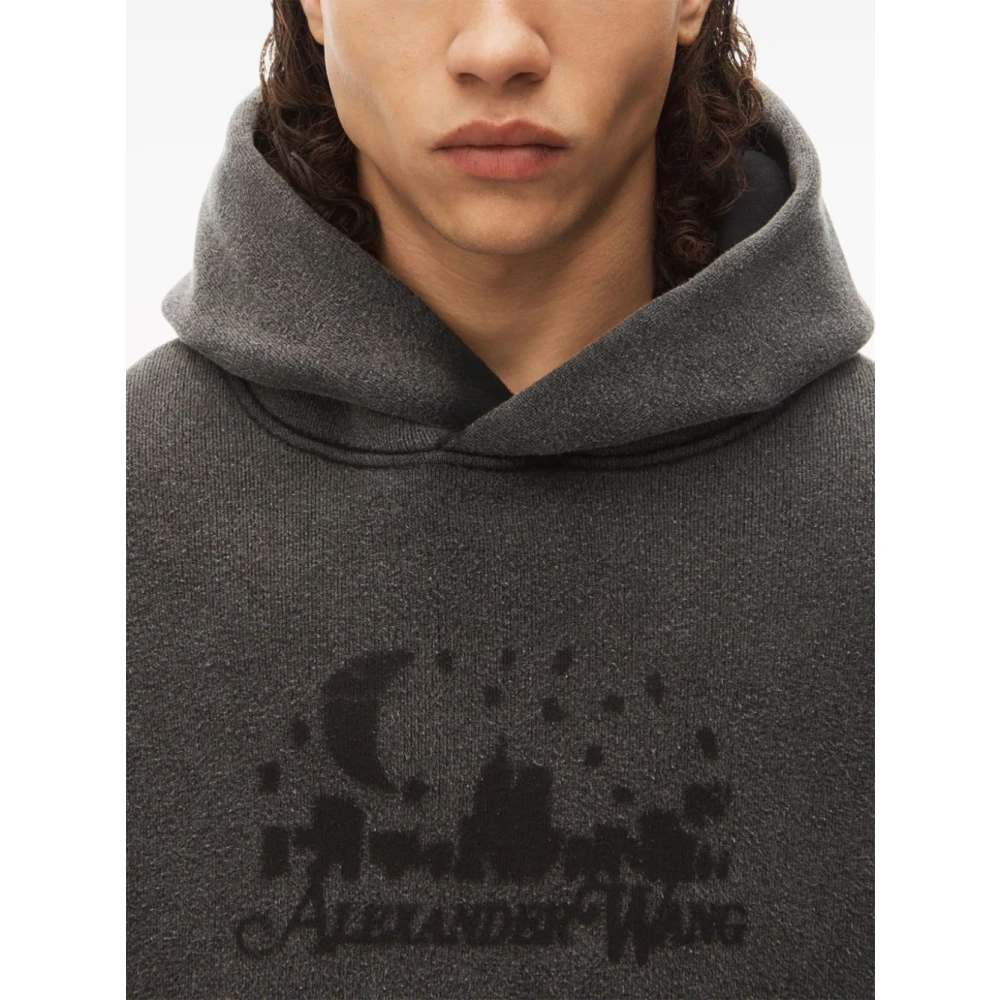 Blijf stijlvol en comfortabel in deze grijze katoenen hoodie van Alexander Wang. Met een voorzak, jersey textuur, verouderd effect en lange mouwen met verlaagde schouders. Afgewerkt met geribbelde zoom en manchetten en een zwarte print aan de voorkant. Perfect voor de modebewuste vrouw.