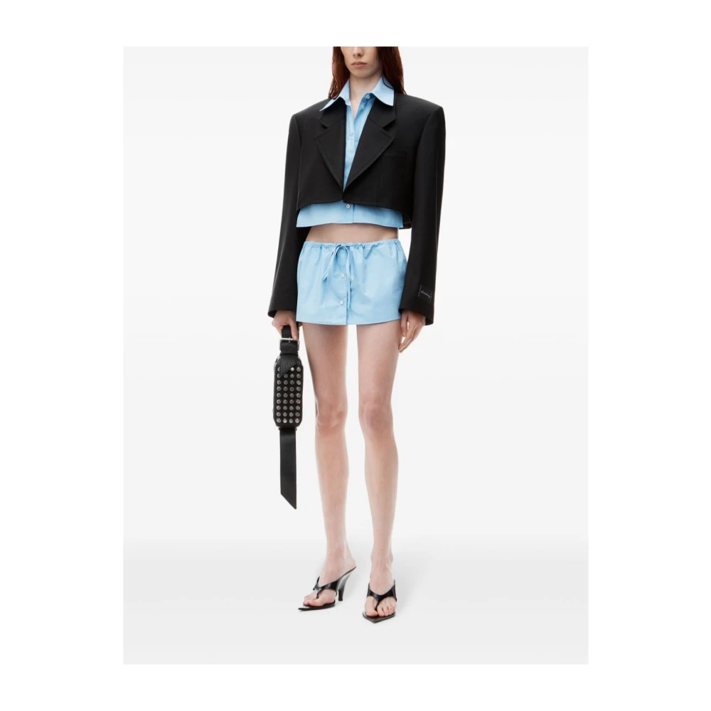 Alexander Wang dames zwarte stretch wollen crop jas, gevoerd met lichtblauwe katoenen crop shirt. Kort model, knooploos, klassieke revers. Slim/crop pasvorm; medium gewicht stof. Stofsamenstelling: 86% wol, 9% polyamide, 5% elastaan.