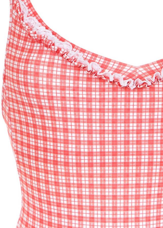 Geruite badpak van Amir Slama voorzien van v-hals, kanten inzetstukken en voering. Zwemkleding moet over uw eigen kleding aan worden gepast.