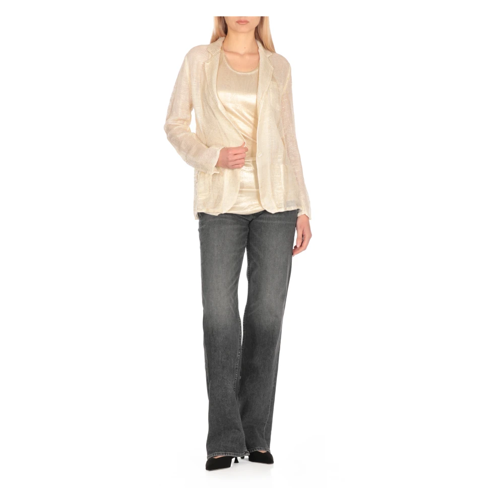 Verrijk je stijl met deze luxueuze gouden Avant Toi linnen blazer voor vrouwen. Met een peak lapel kraag, lange mouwen, knoopsluiting aan de voorkant en drie voorzakken met lurex details. Model is 179 cm lang en draagt maat S.