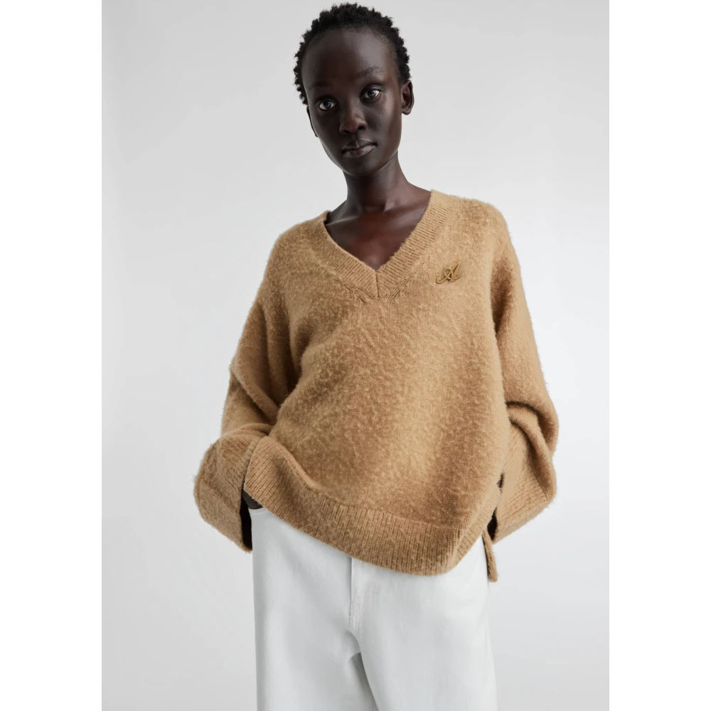 De V-hals Rain-trui is gebreid van een zachte mix van wol en kasjmier die lichtjes verontrust is. Wijde mouwen en een Signature A-speld maken dit stuk af. Het model is 178 cm / 5'10 ft en draagt maat S.