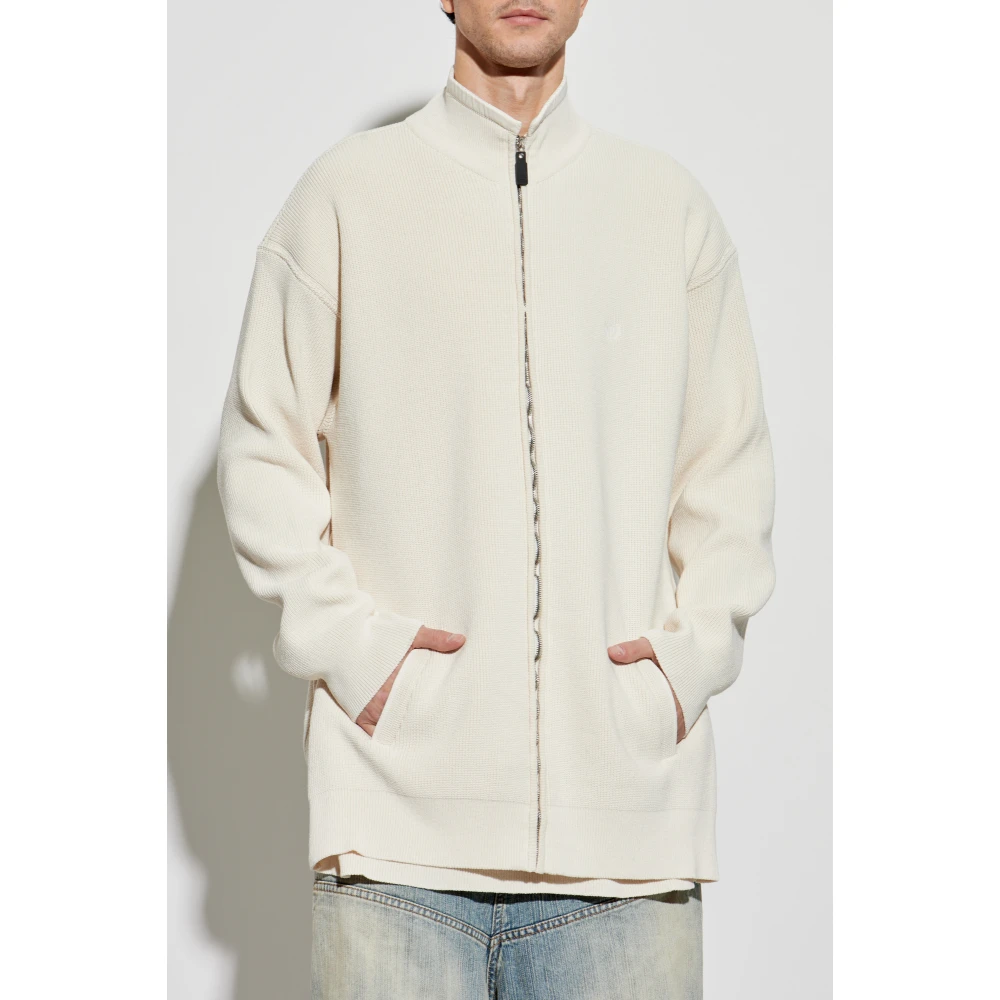 Maak kennis met de cardigan met opstaande kraag van Balenciaga, een meesterwerk van modern minimalisme. Deze crmekleurige cardigan combineert elegantie met hedendaagse mode, vervaardigd uit een mix van katoen en polyester voor een unieke, gestructureerde textuur. Belangrijkste kenmerken: Crme | Beige | Katoen | Polyester | Opstaande kraag | Ritssluiting aan de voorkant | Losse, langere snit | Afmetingen en pasvorm: Losse pasvorm | Samenstelling en onderhoud: 53% Polyester | 47% Katoen | Niet gespecificeerd