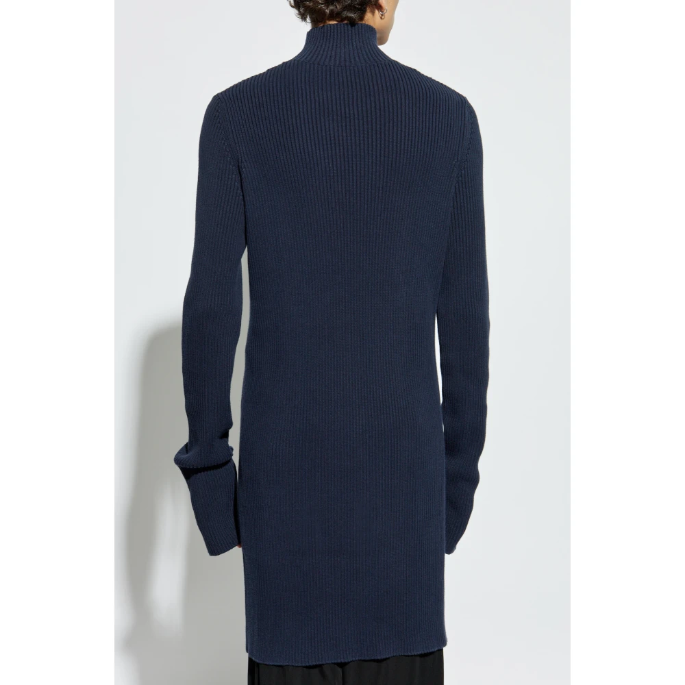 Maak kennis met de Lange Turtleneck Trui uit de exclusieve kledingcollectie, ondertekend door Balenciaga. Dit elegante kledingstuk combineert klassiek design met een moderne twist, waardoor het de perfecte keuze is voor koelere dagen. De turtleneck trui heeft een eenvoudige, lange snit die zich uitstrekt onder de heupen en lange mouwen die comfort en warmte bieden. De hoge turtleneck kraag voegt elegantie toe en verbetert thermisch comfort. Gemaakt van zwaar, geribbeld breisel in marineblauw, ziet de trui er uiterst stijlvol uit. Aan de voorkant van de trui, op borsthoogte, is een geborduurde, kleurrijke