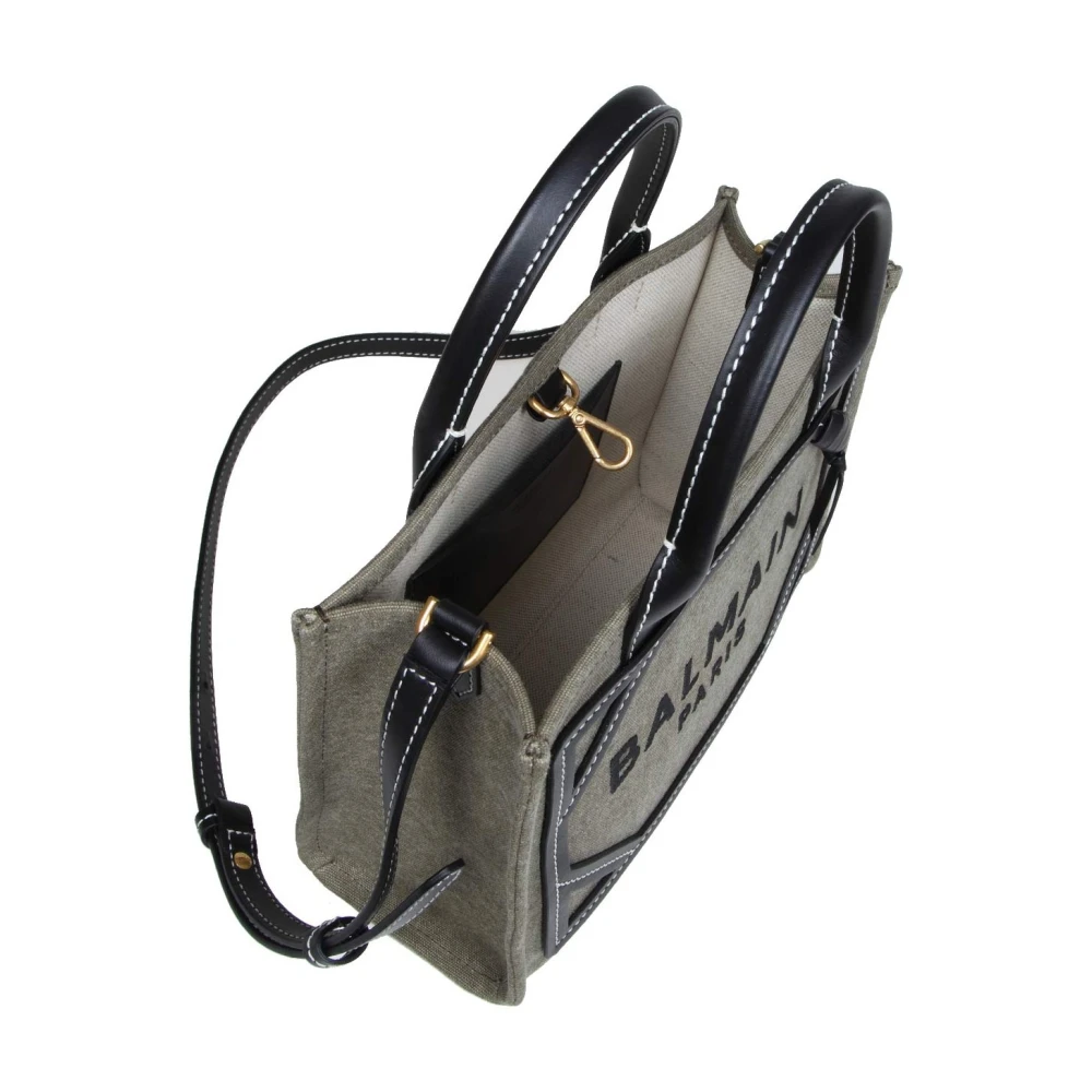 Upgrade je stijl met deze Balmain canvas tote tas in khaki en zwart. Met een geborduurd logo aan de voorkant, leren details en een verstelbare schouderriem. Gemaakt in Itali met een stoffen interieur en n binnenzak. Afmetingen: B26cm x H20cm x D9.5cm.