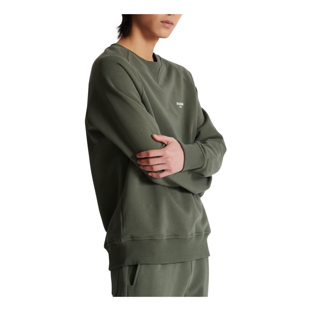 Verhoog je casual stijl met deze groene katoenen sweatshirt van Balmain. Met een ronde hals, raglanmouwen en een relaxte pasvorm is deze sweatshirt perfect voor dagelijks gebruik. Het contrasterende flock Balmain Paris-logo voegt een vleugje luxe toe. Gemaakt van 100% katoen is deze sweatshirt zowel comfortabel als stijlvol. Haal de jouwe vandaag nog in huis en upgrade je garderobe! Regelmatige pasvorm, we raden aan om je normale maat te kiezen.