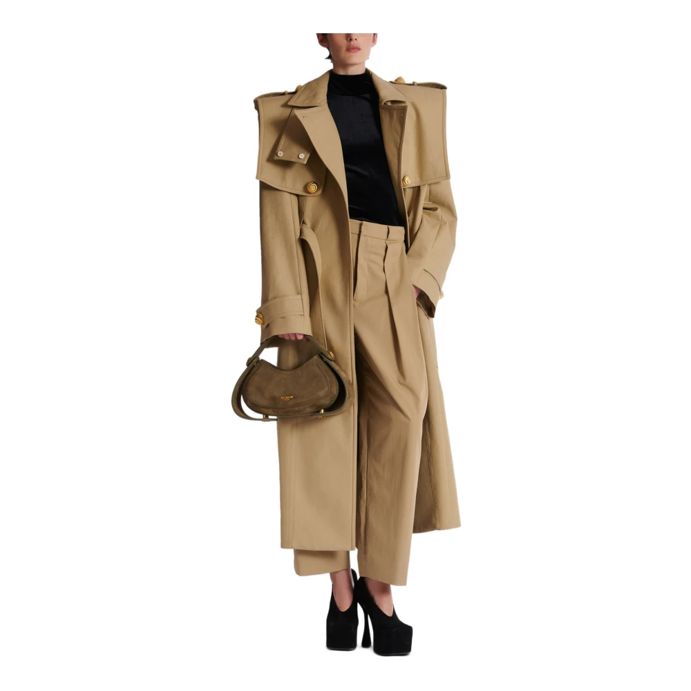 Presentatie van de Velvet High-Neck TOP van het prestigieuze modehuis Balmain, dat elegantie en luxe belichaamt. Gemaakt van fluweel materiaal, straalt deze top een unieke glans en zachtheid uit, waardoor hij perfect is voor avondjes uit en formele gelegenheden. De top heeft een aansluitende pasvorm die de vrouwelijke silhouet benadrukt, lange mouwen en een hoge kraag die een vleugje klasse en verfijning toevoegt. De diep zwarte stof benadrukt verder het elegante ontwerp. Op de rechterschouder bevinden zich drie grote, gouden knopen met een verhoogd patroon, die dienen als een opvallend en onderscheidend decoratief detail. De top heeft ingezette schoudervullingen, die de silhouet structuur geven en een afslankend effect. Op de foto's is het product gecombineerd met zwarte broek met wijde pijpen, waardoor een harmonieus, monochroom ensemble ontstaat. De look wordt afgemaakt met zwarte stiletto's en een kleine zwarte tas. Waarom ZOU U DIT Product Kopen? * Exclusief fluweel materiaal met uitzonderlijke zachtheid en glans * Elegant ontwerp met hoge kraag en gouden knopen * Aansluitende pasvorm die de vrouwelijke silhouet benadrukt * Ingezette schoudervullingen voor extra structuur * Perfect voor avondjes uit en formele gelegenheden Model's Afmetingen Hoogte: 177 cm Buste: 83 cm Taille: 61 cm Heupen: 89 cm Model draagt maat: 36