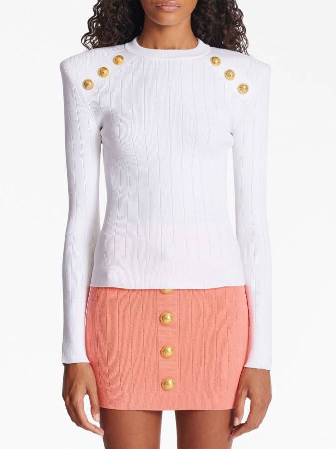 Optisch wit, pointelle gebreid, fijngebreid, ronde hals, goudkleurige knopen met relif, lange mouwen, schoudervullingen en geribbelde manchetten en zoom. Dit product bevat meer dan 50% gecertificeerde van hout afgeleide materialen. Deze materialen zijn gecertificeerd, wat betekent dat ze afkomstig zijn uit verantwoord beheerde bossen die ontbossing tegengaan en zorgen voor een eerlijk loon en arbeidsmilieu, behoud van biodiversiteit en gemeenschapsrechten.. .