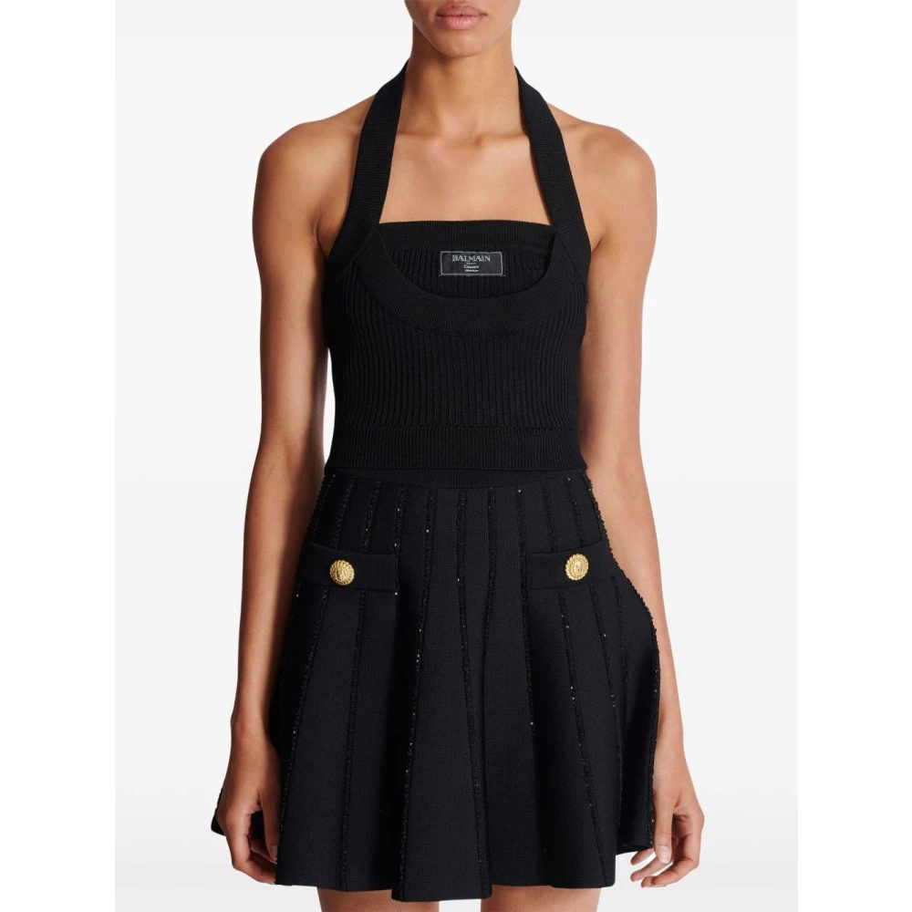 De Balmain Geribbelde Gebreide Haltertop is een chique en veelzijdige toevoeging aan je garderobe, perfect voor zowel casual als formele gelegenheden. Belangrijkste kenmerken: Zwart | Viscose | Halternek | Geribbelde textuur | Gouden metalen versieringen | Afmetingen en pasvorm: Normale pasvorm | Samenstelling en onderhoud: 100% Viscose | Uitsluitend chemisch reinigen