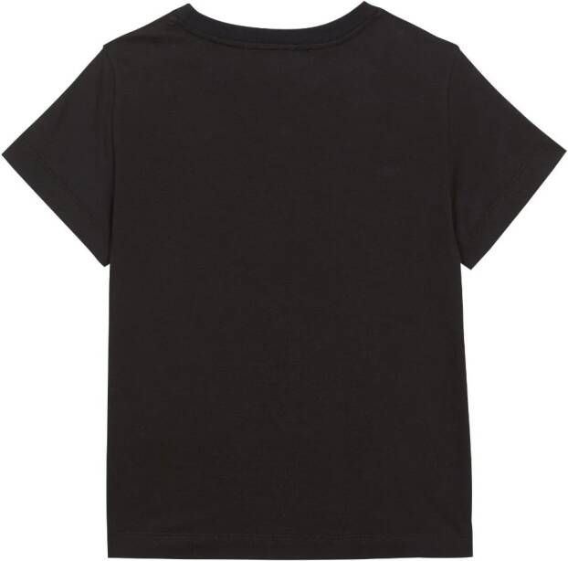 Zwart, katoen, ronde hals, verfraaid met bergkristallen, logo stempel op de voorkant, korte mouwen en rechte zoom.