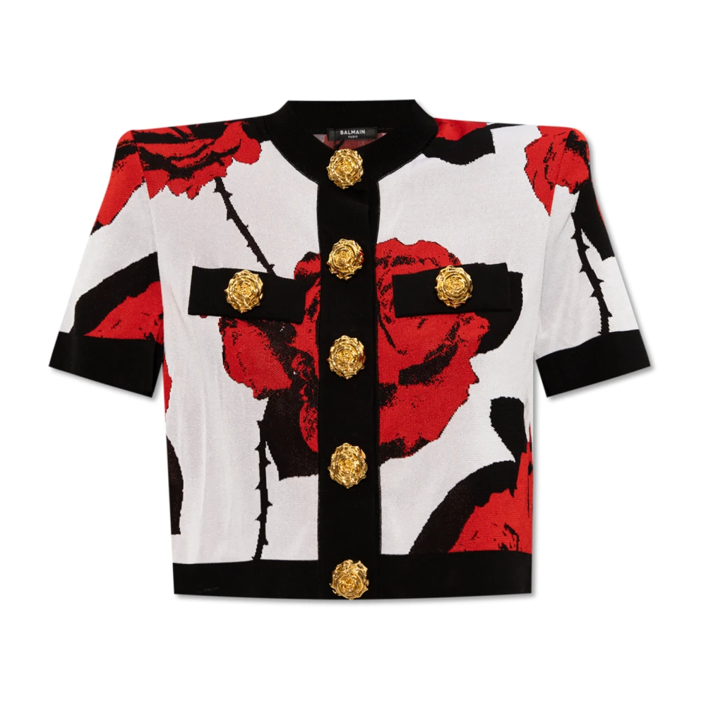 De Cardigan met Rozenmotief van Balmain is een opvallend kledingstuk, met een bloemmotief en goudkleurige roosvormige drukknoopsluitingen, perfect om een vleugje elegantie aan elke outfit toe te voegen. Belangrijkste kenmerken: Zwart | Wit | Rood | Bloemmotief | Roosvormige drukknoopsluitingen | Decoratieve zakken | Gepolsterde schouders | Geribbelde boorden bij de ronde hals, zoom en manchetten |