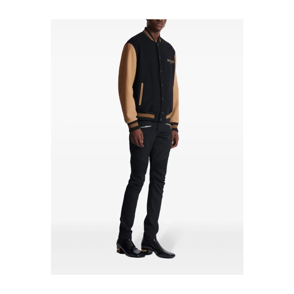 Tweekleurige wollen en kasjmier varsity-jas Losse pasvorm Geribbelde kraag Contrasterende lange mouwen 2 schuine zijzakken Sluiting met 7 bedekte drukknopen Contrasterend vintage Balmain-logo geborduurd op de voor- en achterkant Gestreepte geribbelde afwerking Binnenzak met drukknoop Satijnen voering Model meet 190 cm en draagt maat 48 Hoofdmateriaal: 90% zuivere wol 10% kasjmier Gemaakt in Itali Artikel: Dh 0Tf 612Wb 50