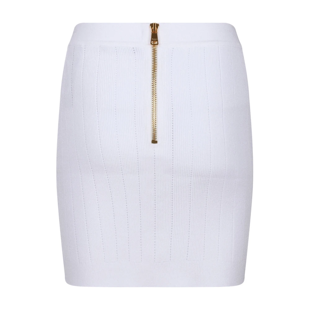 Upgrade je garderobe met deze Balmain Witte Mini Rok, met een hoge taille en relif gouden knopen voor een verfijnde look. Perfect voor een avondje uit of een speciale gelegenheid. Belangrijkste kenmerken: Wit | 83% Viscose | 17% Polyester | Ritssluiting aan de achterkant | Nepzak detail | Geribbelde boorden | Hoge taille | Samenstelling en onderhoud: 83% Viscose | 17% Polyester