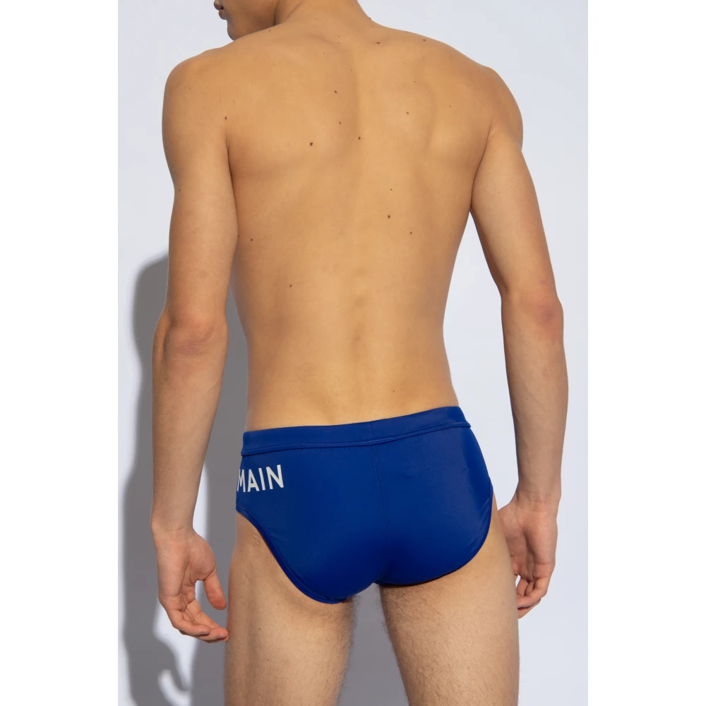 Donkerblauwe zwembroek van Balmain. Dit paar heeft een elastische trekkoordtailleband en een wit logo print. Modelmaten Lengte: 193 cm Borst: 95 cm Taille: 82 cm Heupen: 93 cm Model draagt maat: M