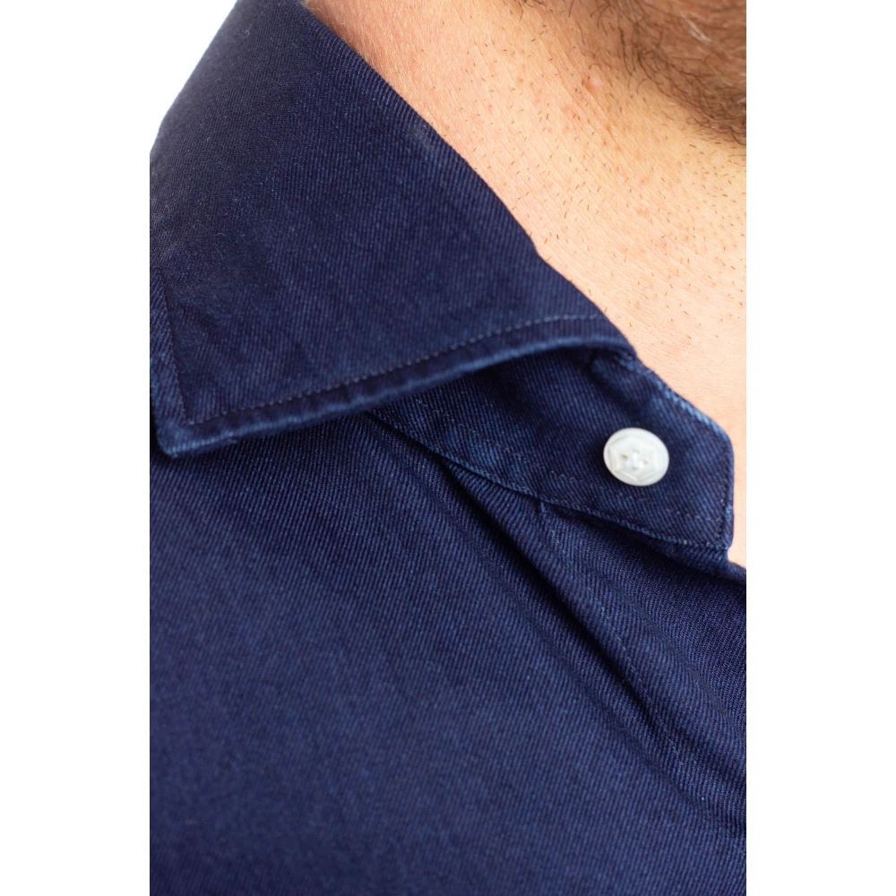 Barba denim maatshirt met parelmoer knopen en achterplooien. Perfect voor informele en semi-formele gelegenheden in combinatie met een jas. Kenmerkende versleten look bereikt door speciale verf- en wasprocessen en exclusieve patronen. Handgemaakte details zijn onder andere knoopapplicatie met klassieke lelie-stiksels, geborduurde knoopsgaten, mouw- en schoudernaden en Barba-logo mouches onderaan de shirt.