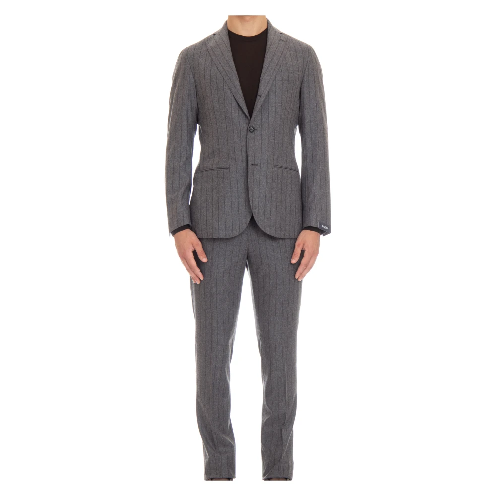 Barba Single Breasted Suit Set voor mannen. Monopetto jas gemaakt van 300 gram/meter stof. Enkellijnig model met vier echte knoopsgaten onderaan klaar om te openen. Spiegel revers. Klepzakken. Gedeeltelijk gevoerde jas met twee interne zakken. Broek met plooien. Model draagt maat 48.