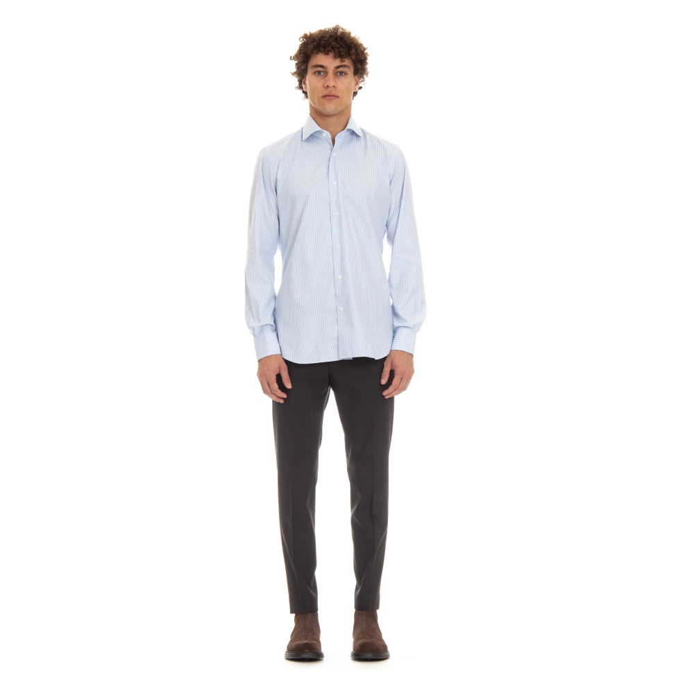 Barba herenoverhemd van twill katoen met parelmoer knopen en achterplooien. Dit overhemd is gewassen voor een klassieke maar moderne uitstraling. Handgemaakte details zijn onder andere de lelie-steek knoopapplicatie, geborduurde knoopsgaten, armgatstiksels, schouderstiksels en mouches met het Barba-logo onderaan.