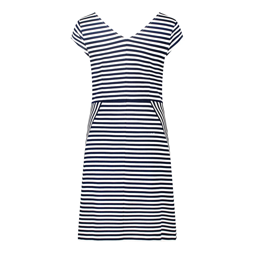 Upgrade je stijl met deze gestreepte jersey jurk van Betty Barclay. De nauwsluitende snit accentueert prachtig de vrouwelijke vorm, aangevuld met het trendy gestreepte patroon. Met een elegante V-hals en modieuze halve mouwen is deze jurk een veelzijdige keuze voor diverse gelegenheden.
