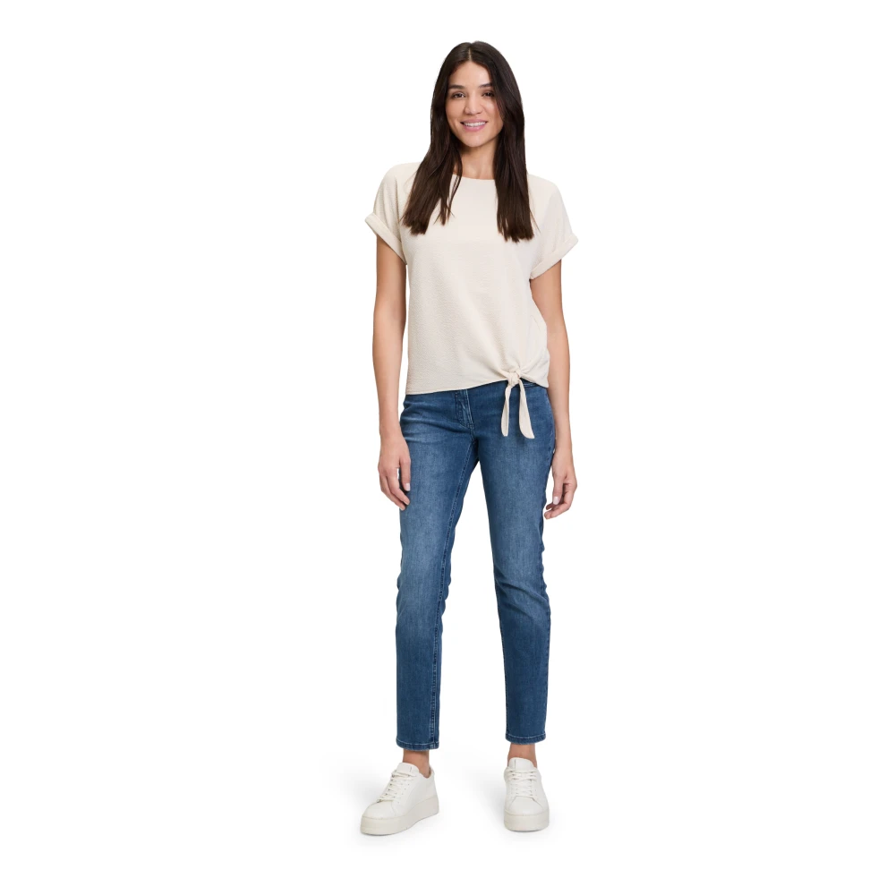 Dit halfarmshirt van Betty Barclay met een strik is cool en casual tegelijk! Gemaakt van gestructureerde kreukstof, heeft het een relaxte, rechte snit. De boothals en de verlaagde schouder geven het een relaxte uitstraling. De omgeslagen mouwen voegen een speels tintje toe, perfect voor vrijetijdsactiviteiten en ontspannen gelegenheden.