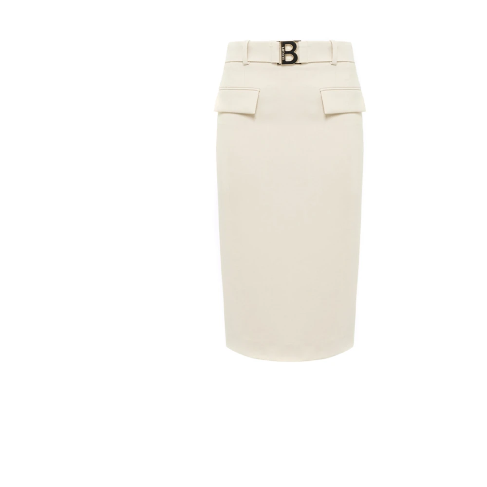 Upgrade je stijl met deze witte Blugirl kokerrok. Voorzien van een stretch-design, goudkleurige logoplaat, verborgen haak- en ritssluiting aan de achterkant, lusjes voor een riem, kokerrok silhouet, twee voorflapzakken, achterkant split, volledige voering, rechte zoom en middellange lengte.