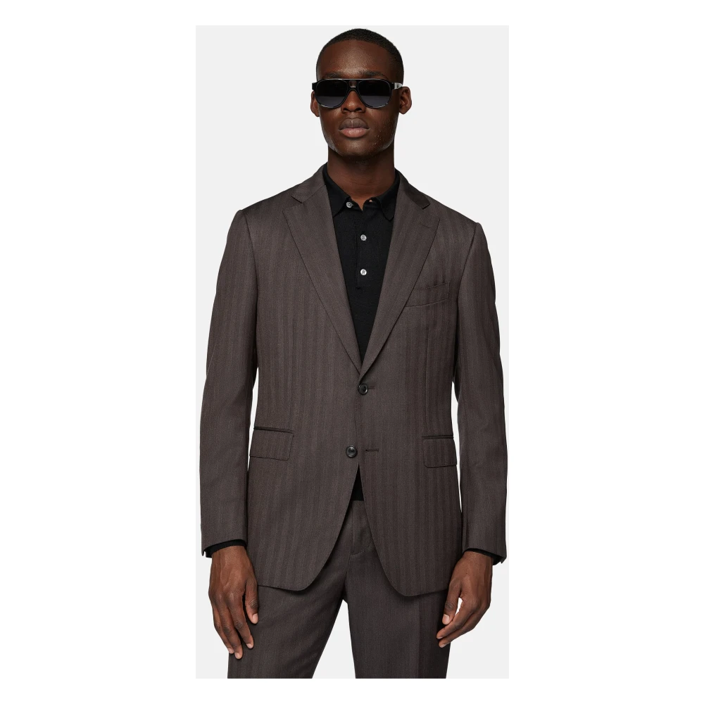 Pak met visgraatmotief in 130 S zuivere wol. Pak met normale pasvorm en op maat gemaakte constructie, enkele rij knopen, volledig gevoerd en met klepzakken. Pantalon met normale pasvorm.