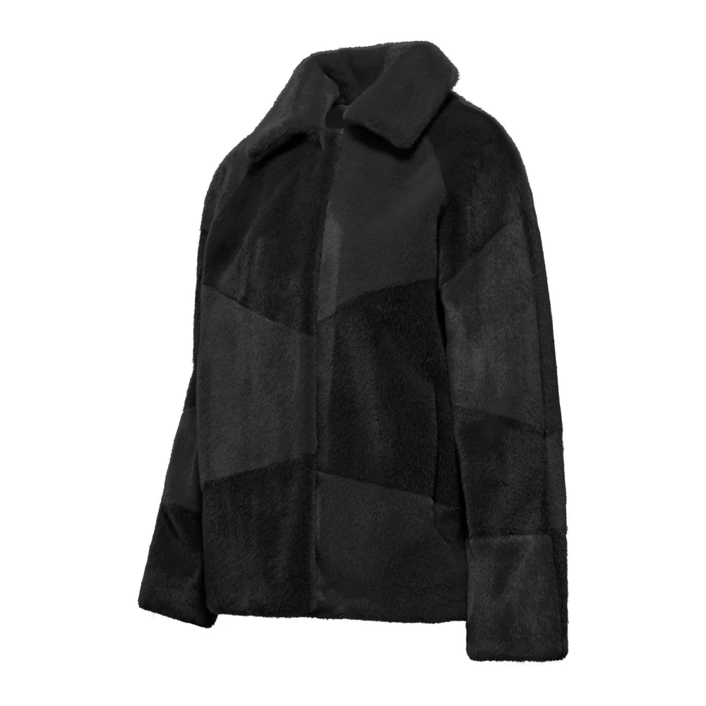 Blijf stijlvol en gezellig in deze Bom Boogie faux fur & shearling jas voor vrouwen. De loszittende korte jas heeft een tweekleurig geruit patroon, gemaakt van extra zacht 100% polyester stof. Perfect voor wie op zoek is naar een kledingstuk met persoonlijkheid.