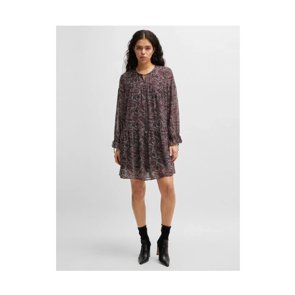 Mini-jurk van BOSS Orange. Los model. Model 'Diveno'. Semi-transparant. Druppelvormige hals. Ronde hals. Plooien. Volants. Ruglengte bij maat 36: 89 cm. Borstomvang bij maat 36: 50 cm. Mouwlengte bij maat 36: 64 cm