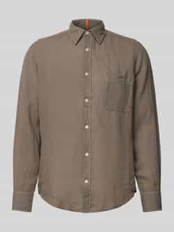 Linnen herenoverhemd van BOSS Orange. Puur linnen. Regular fit. Model 'Relegant'. Kentkraag. Doorknoopsluiting. Borstzak. Ruglengte bij maat M: 79 cm. Schouderbreedte bij maat M: 45 cm. Mouwlengte bij maat M: 68 cm