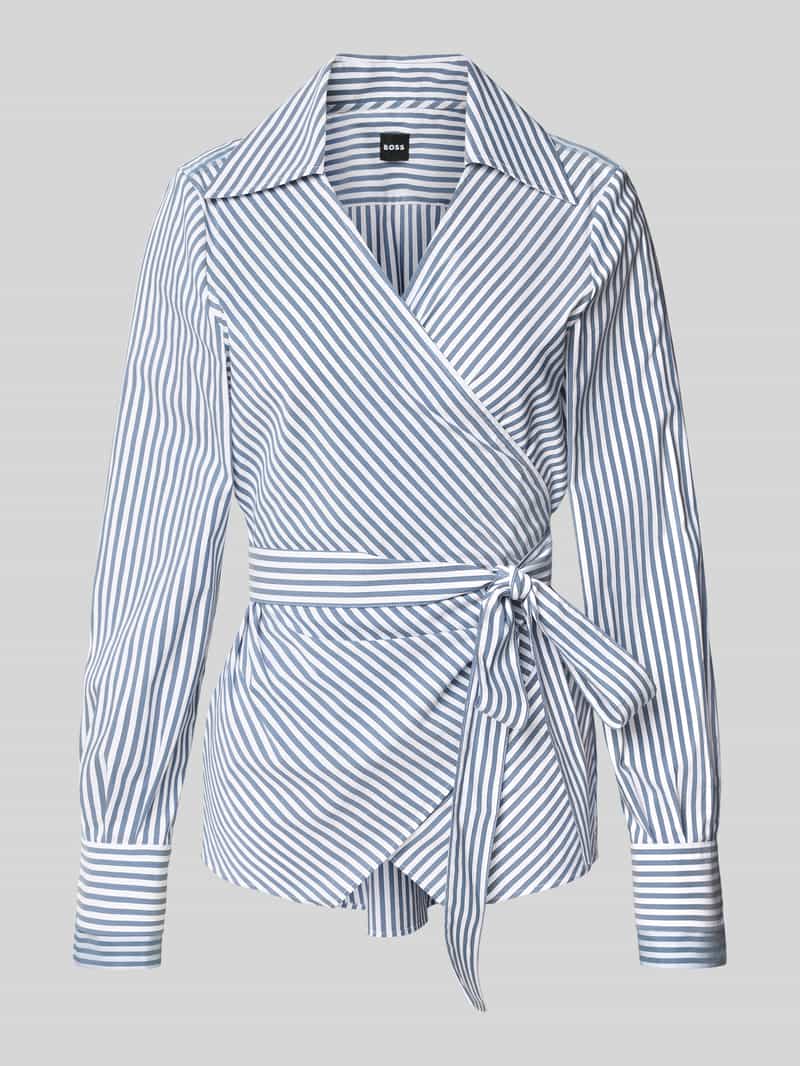 Damesblouse met lange mouwen van BOSS. Model 'Bekania'. Look: All-over motief. Pasvorm: Regular fit. Kraagmodel: Overhemdkraag. Motief: gestreept. Details: Tailleriem om te strikken. Hals: V-hals. Mouwvorm: lange mouwen. Mouwboord: Manchet. Materiaalverwerking: Twill. Materiaal: Katoenmix. Ruglengte bij maat S: 67 cm. Borstomvang bij maat S: 51 cm. Mouwlengte bij maat S: 64 cm