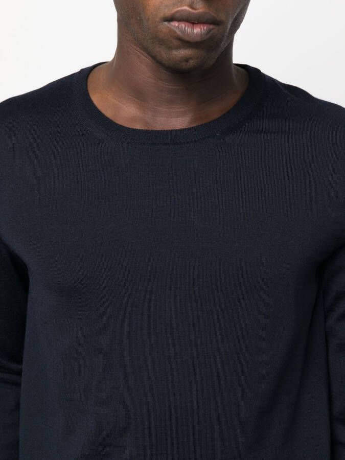 Marineblauw, scheerwol, fijngebreid, ronde hals, lange mouwen en geribbelde zoom.
