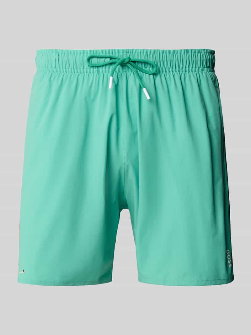 Zwembroek van BOSS voor heren. Look: effen. Applicatie: Labelprint. Details: Contraststrepen. Boord: elastisch met tunnelkoord. Sport: Zwemmen. Zakken: Achterzak met klittenbandsluiting en steekzakken opzij. Bandwijdte bij maat M: 37 cm. Binnenbeenlengte bij maat M: 14 cm