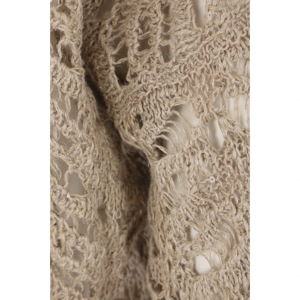 Upgrade je garderobe met deze Brunello Cucinelli cardigan in beige linnen en zijde mix openwork-breisel, versierd met transparante pailletten. Voorzien van een V-hals, knoopsluiting, lange mouwen en geribbelde randen. Normale pasvorm, valt op maat.