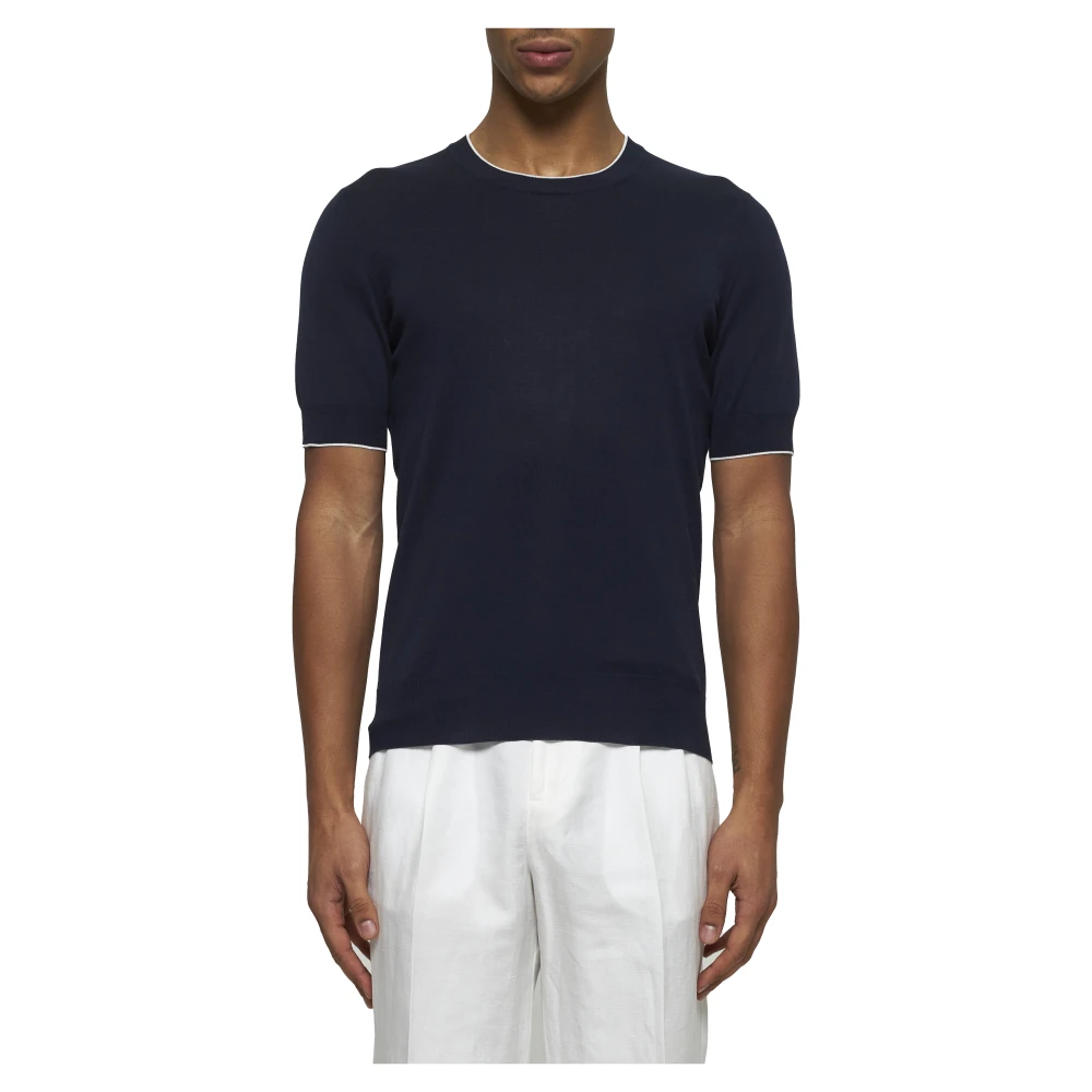 Upgrade je stijl met deze Brunello Cucinelli ronde-hals knitwear in het blauw. Gemaakt in Itali van 100% katoen, het heeft een geribbelde halslijn, korte mouwen, geribbelde manchetten en onderboord, contrasterende randdetails en een eenvoudig gebreid ontwerp. Met een regular fit is deze knitwear perfect voor de moderne man.