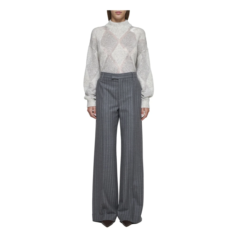 Upgrade je wintergarderobe met deze luxueuze Brunello Cucinelli mohair blend trui. Het argyle intarsia breimotief in tinten van parelgrijs, versierd met pailletten, voegt een vleugje glamour toe. Met een opstaande kraag, verlaagde schouders en geribbelde randen is deze coltrui een stijlvolle keuze voor de modebewuste vrouw.