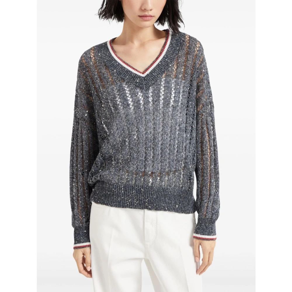 Verrijk je garderobe met deze Brunello Cucinelli V-hals gebreide trui voor vrouwen in antracietgrijs met streepdetail en open breisel.
