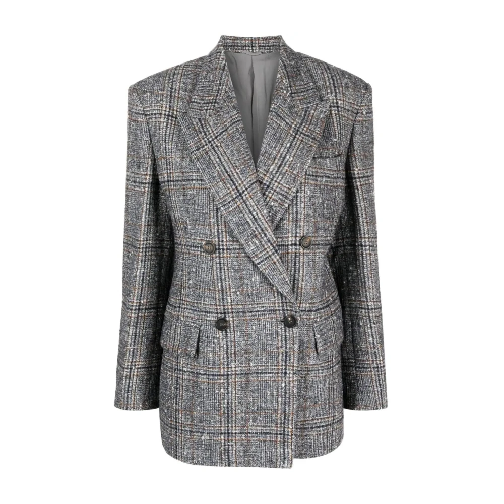Upgrade je garderobe met deze verfijnde Brunello Cucinelli grijze wollen double-breasted jas voor vrouwen. Met een peak lapel kraag, achterste diamant gesneden messing detail, lange mouwen met knopen bij de manchetten, voorknopsluiting, twee voorflapzakken, n borstzak en een achterste split aan de zoom. Het allover visgraatpatroon voegt een vleugje elegantie toe aan deze klassieke blazer.