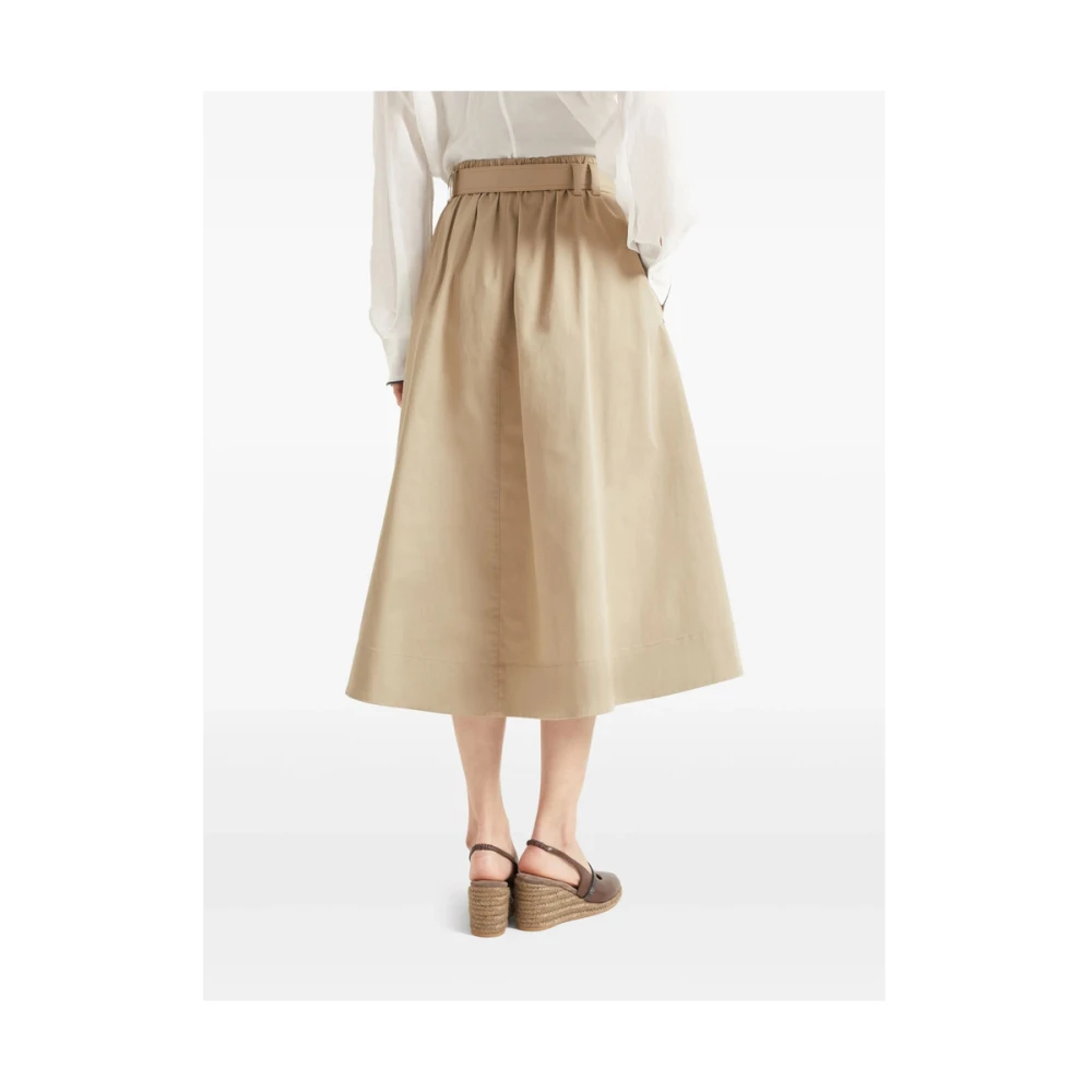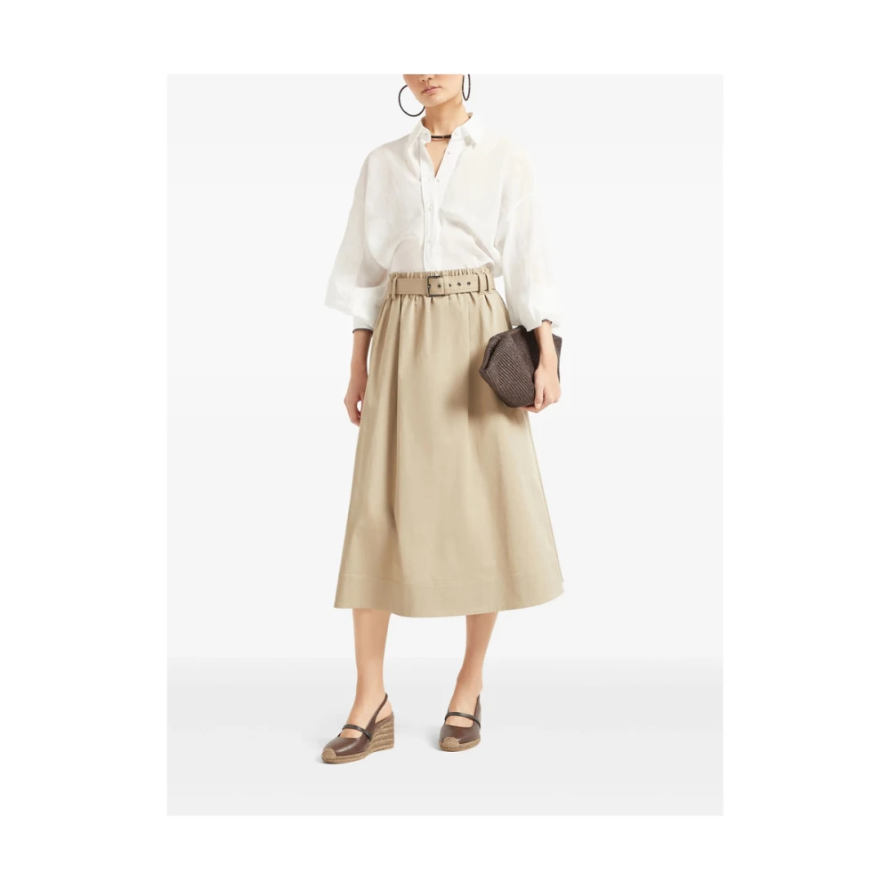 Upgrade je garderobe met deze beige midi-rok met hoge taille van Brunello Cucinelli. Met een elastische tailleband, riemlussen en twee zijdelingse insteekzakken is deze rok een veelzijdige en stijlvolle keuze voor elke gelegenheid.
