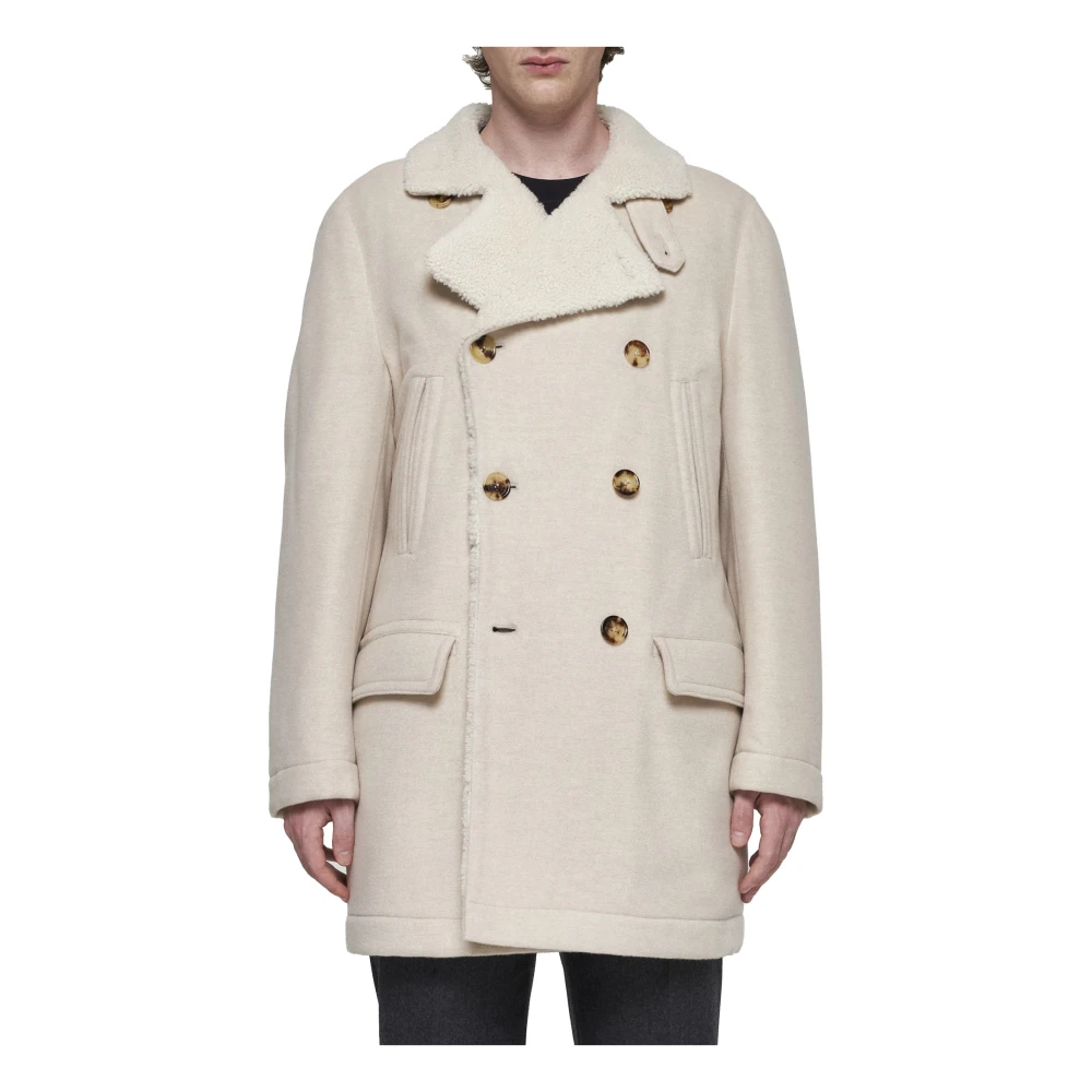 Upgrade je wintergarderobe met deze luxueuze Brunello Cucinelli ivoorkleurige kasjmier dubbelrijige jas voor heren. Gemaakt met shearling voering, brede inkeping revers, een geknoopte riem bij de kraag en praktische zakken, combineert deze jas stijl en functionaliteit moeiteloos.