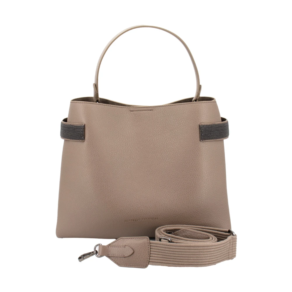 Verrijk je stijl met deze Brunello Cucinelli handtas gemaakt van kostbaar Texture kalfsleer. Het moderne ontwerp heeft twee geborduurde juweel inserts voor verstelbare breedte, een glanzend effect en een verstelbare/afneembare schouderband. Afmetingen: 31x 25x 14 cm.
