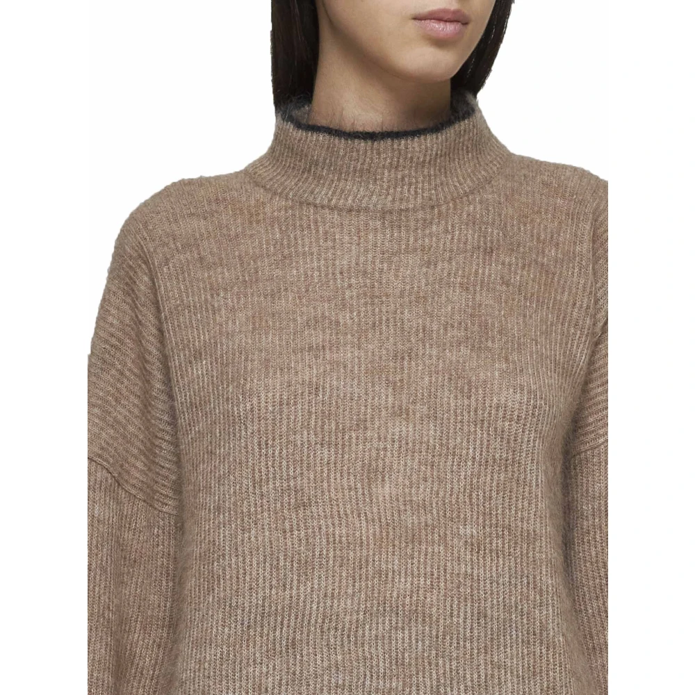Upgrade je wintergarderobe met deze luxueuze Brunello Cucinelli lichtbruine geribbelde gebreide trui. Gemaakt van een mohair en wolmix, heeft het een chique zwarte rand langs de opstaande kraag, verlaagde schouders en een verstelbaar trekkoord aan de zoom. Blijf gezellig en stijlvol in deze must-have coltrui voor vrouwen.