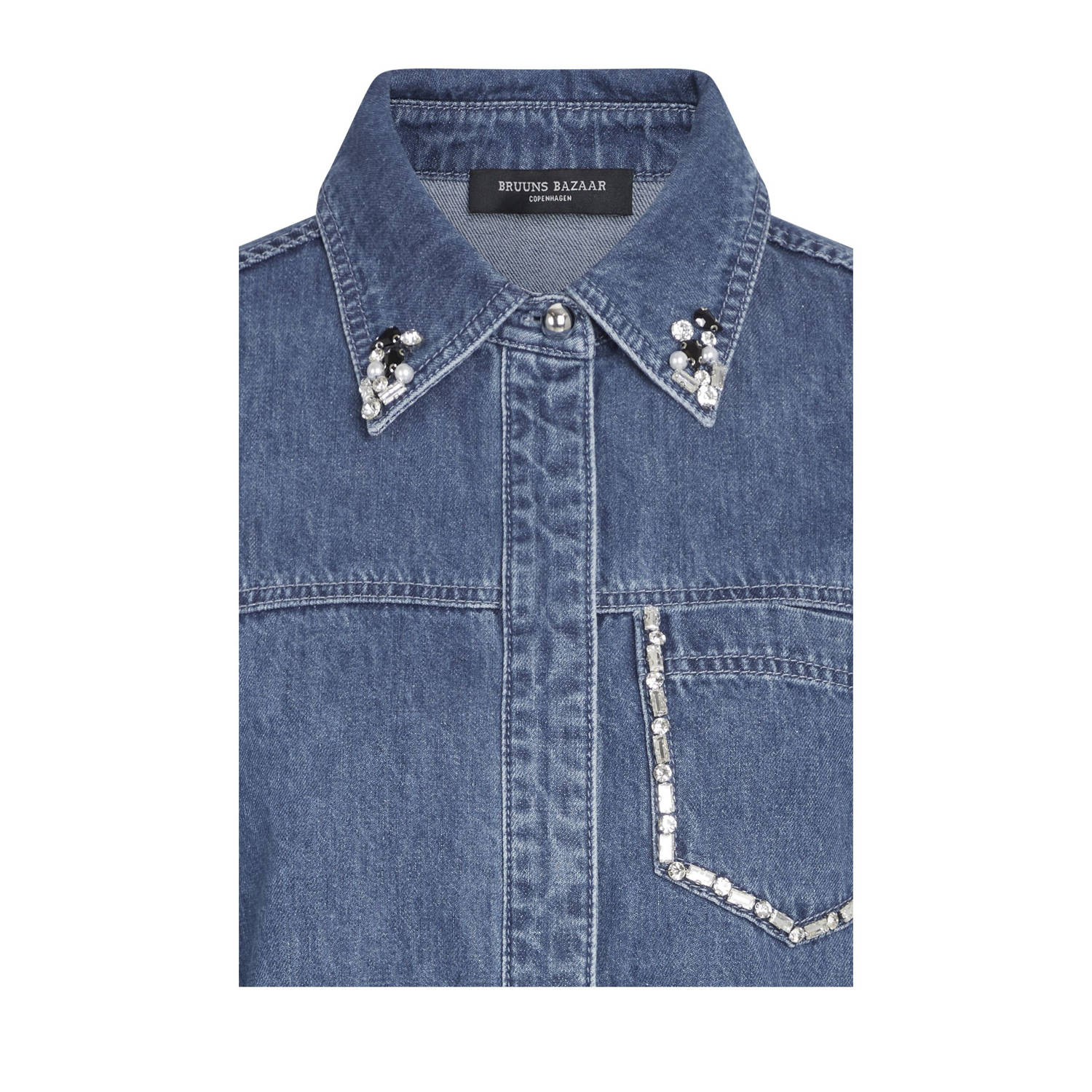 Deze damesblouse van Bruuns Bazaar is gemaakt van denim. De blouse heeft een klassieke kraag en een knoopsluiting. De lange mouwen en de borstzak maken het een veelzijdig kledingstuk. Sierstenen geven een subtiel accent