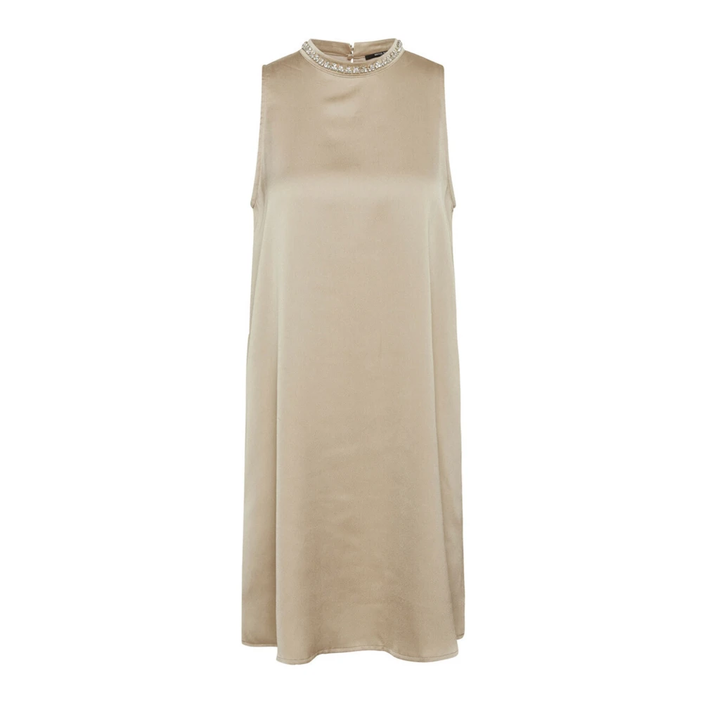 Deze damesjurk van Bruuns Bazaar is gemaakt van polyester. Het model beschikt over een knoopsluiting. De jurk is mouwloos en heeft verder een ronde hals.details van deze jurk:strass steentjes