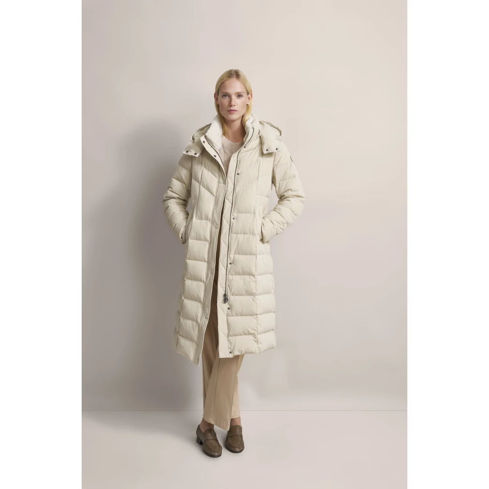 Getailleerde, lange gewatteerde jas in compacte stof met vrouwelijk gewatteerd ontwerp, afneembare capuchon en afneembare imitatiebontkraag. De Sorona-vulling, een vulvezel op basis van hernieuwbare grondstoffen, zorgt voor een ideale warmte-isolatie. Contrasterende details in het interieurontwerp voegen kleuraccenten toe.