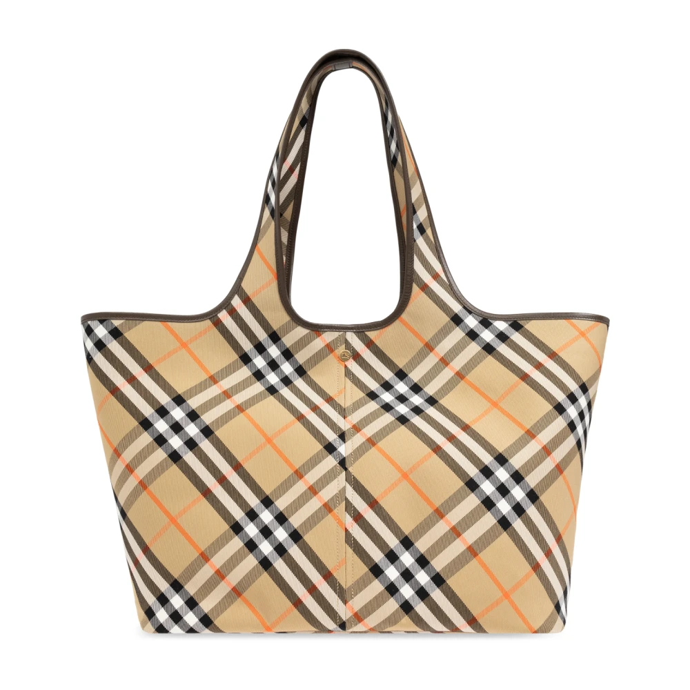 This spacious tote bag by Burberry showcases a striking check design, crafted from durable cotton. Two top handles and a secure snap fastener closure provide versatile carrying options, making it a stylish addition to any casual outfit.- Dimensions: 39cm (L) x 19cm (W) x 32cm (H)- Material: 100'%' Cotton; Lining: Leather- Made in Vietnam