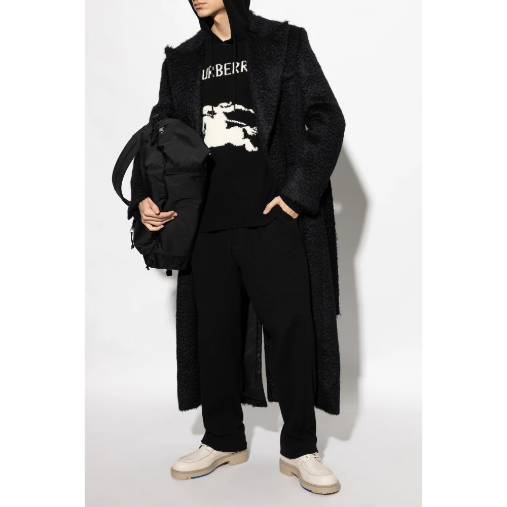 Maak kennis met de Wool Hoodie Sweater van het legendarische merk Burberry, die elegantie en moderne stijl belichaamt. De Zwarte tint gecombineerd met zachte wol en een vleugje kasjmier zorgt voor ongevenaard comfort en warmte. De trui heeft een Groot, WIT Print met een paard en ruiter samen met